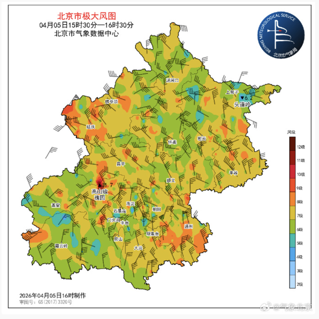 受冷空气影响,今天(4月5日)白天我市有大风天气,偏北风4级左右,阵风7~8级,平原地区极大风速在海淀车道沟22.4米/秒(9级);近一小时,平原地区极大风速为通州区南马庄21.8米/秒(9级)。