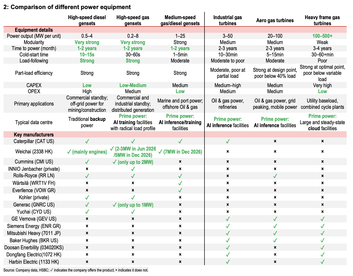 汇丰认为,天然气发电机组凭借交期短、启动快、灵活性高等优势,正快速取代燃气轮机,成为AI数据中心首选的过渡性主电源。头部厂商订单已排满至2027年底,预计供应紧张态势将延续至2027至2028年,设备价格在此期间每年仍将上涨10%至15%。