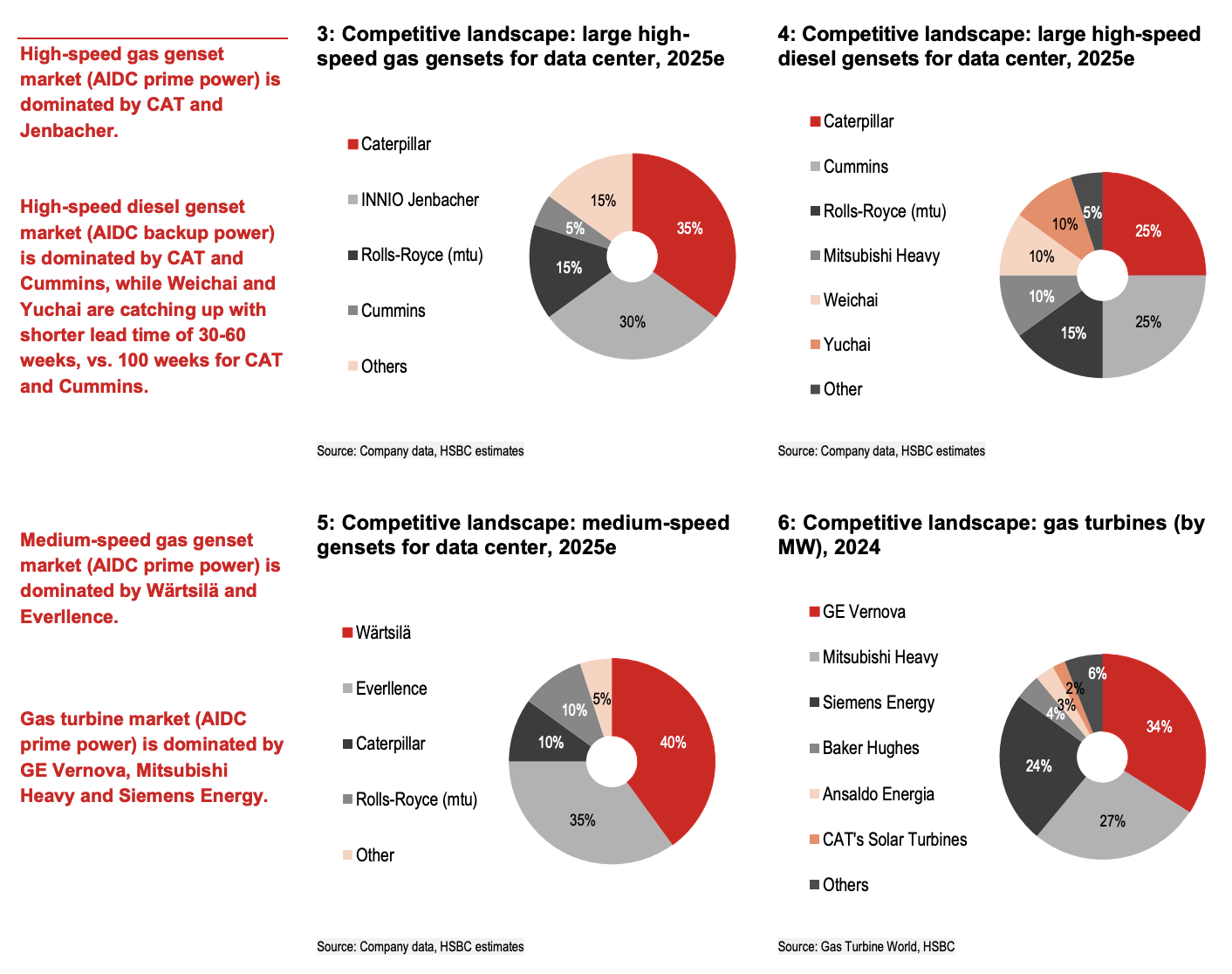 在高速天然气发电机组领域,卡特彼勒和INNIO Jenbacher合计占据约65%的市场份额,两家公司订单均已排满至2027年底。中速发电机组市场则由Wärtsilä和Everllence主导,市占率合计约75%,同样处于满负荷状态。